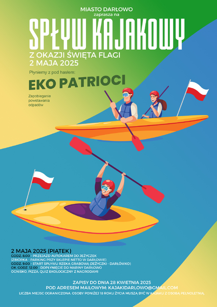 Dzień Flagi Rzeczypospolitej Polskiej w kalendarzu przypada na 2 maja. Z tej okazji Miasto Darłowo organizuje już drugą edycję spływu kajakowego. Popłyniemy udekorowani w biało-czerwone barwy pod hasłem „EKO PATRIOCI”.